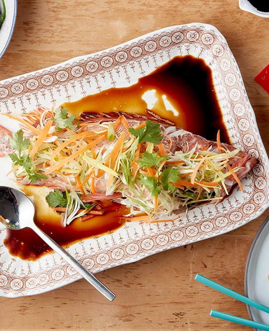 Give this classic Chinese recipe a try! Julienne 2 scallions into 2-inch batons. Cut 1 more scallion into 1-inch segments. Peel a 1-inch knob ginger; cut off a few thin slices, then julienne the remainder. Roughly chop 10 sprigs cilantro. In a small bowl, whisk 1/4 c light soy sauce, 1/4 c hot water, 1/4 tsp salt, and 3/4 tsp sugar until dissolved. Prepare a steamer basket over boiling water. Use a paper towel to pat dry the surface of one whole 2 lb fish (or two 8-10 oz white fish fillets). Lay fish on a heatproof plate that will fit inside steamer. Drizzle over 2 tbsp soy sauce mixture; place ginger slices and scallion segments on top. Nestle plate with fish inside steamer and cover. Lower heat to medium and bring water to a slow boil. Cook until done (flesh should be fully opaque and yielding), 7-10 minutes. Carefully remove plate from steamer; reserve about half the juices on plate. Slice fish and arrange on a serving platter with juices. Garnish with half each of the julienned scallions, ginger, and cilantro. Heat 2 tbsp oil over medium heat in a medium pan. Add remaining ginger and cook until aromatic, about 1 minute. Toss in remaining scallions, then add remaining cilantro and soy sauce mixture. Bring to a simmer, then pour over fish and serve. Note: if you do not have a steamer, fish can be prepared en papillote in aluminum foil.
