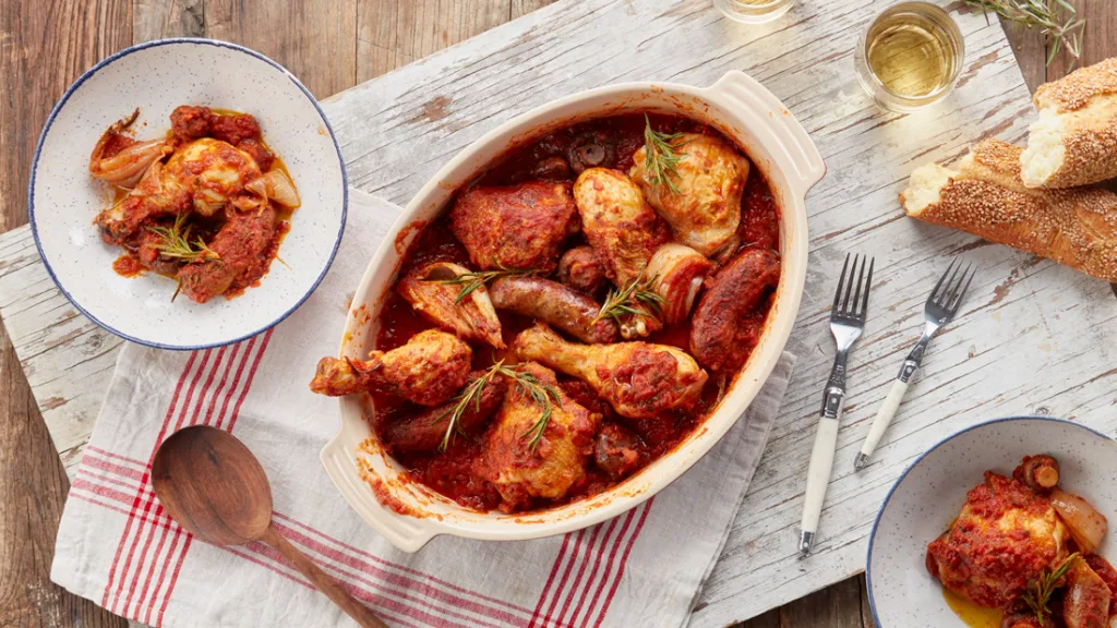 To put it together, you’ll need skin-on chicken drumsticks or thighs, Italian sausage (optional, but it add a wonderful savory flavor), and a medley of vegetables and herbs. Everything is simmered in a rich tomato sauce until the meat is so tender, it almost falls off the bone. You’ll definitely want something starchy on the side to soak up all the juices: pasta and polenta are excellent, though you always could just go with a crusty loaf of bread.