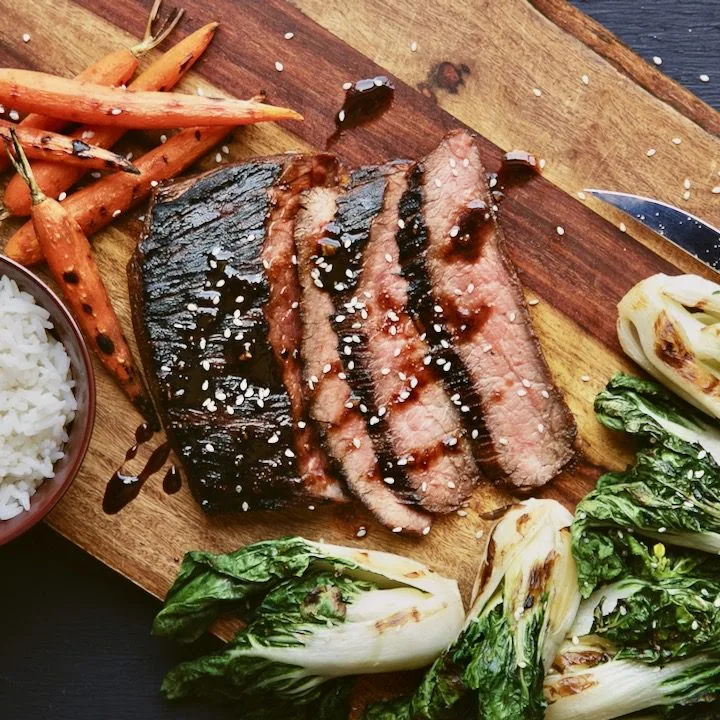 Grilled Marinated Flank Steak with Choi Sum and Baby Carrots