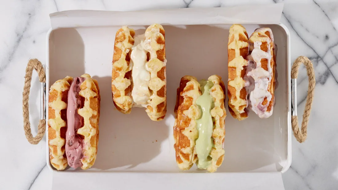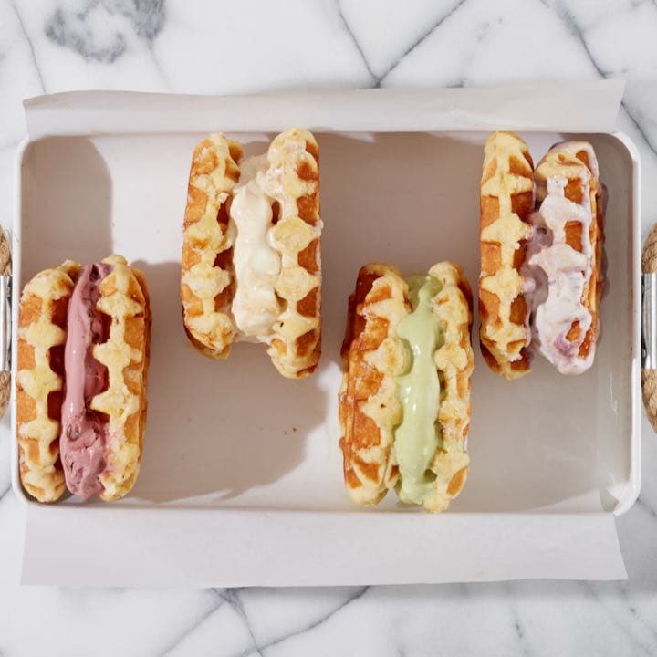 Cookies aren’t the only option, though. Waffles are a great choice because their nooks do a superb job of catching any melted ice cream. Brownies and blondies are a wonderfully decadent option. Other possibilities include rice crispie squares, graham crackers, brioche bread, or even a sliced in half doughnut.