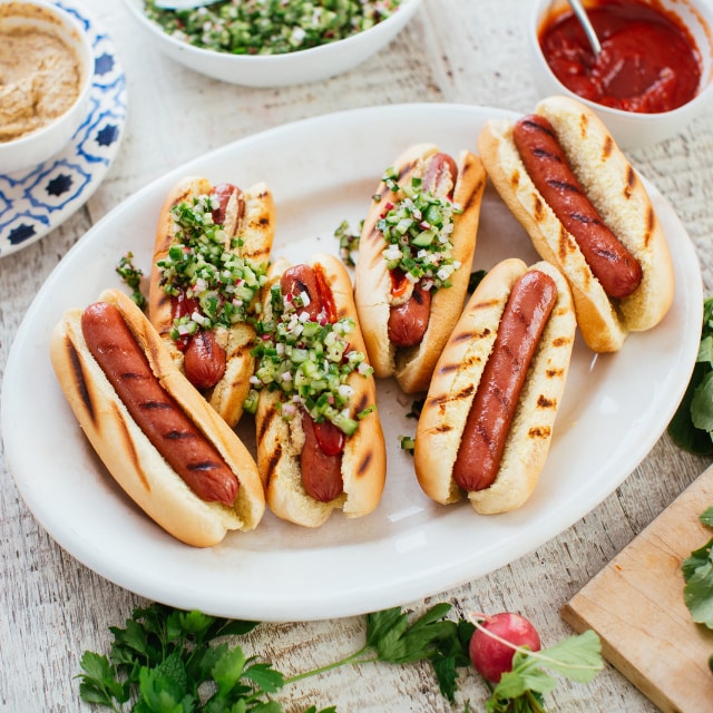 » Hot Dogs with Cucumber Relish and Harissa Ketchup