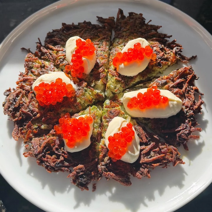 These potato pancakes make a statement with heaps of herbs, deeply crisp edges, and dollops of salmon caviar.