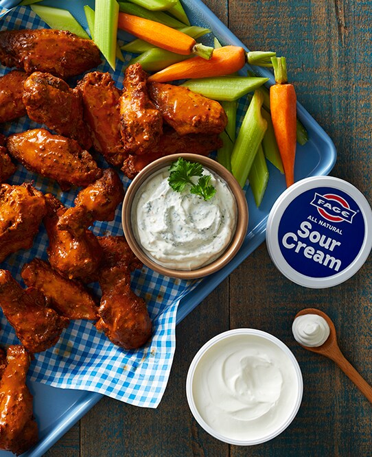 View allIn a medium size bowl, mix 2 cups Fage sour cream, 1 small minced onion, 1 minced garlic clove, 1.5 tbsp chopped chives, 1 tsp garlic powder, 1 tsp salt, and 1 tsp pepper. Keep in refrigerator for at least 30-45 minutes before serving to meld flavors.