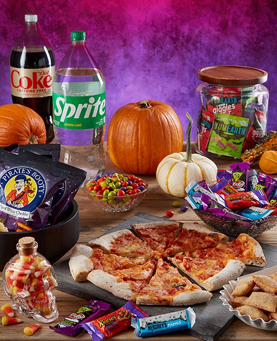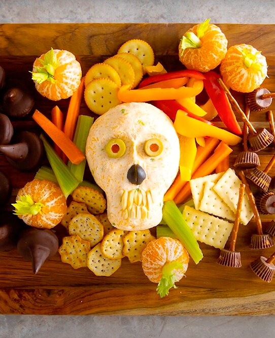 View allLittle ghosts and goblins will love this grazing board that's all dressed up for Halloween. Here's what you'll need to build one for your party: 1) Make clementine "pumpkins" by putting celery sticks in the center of the the peeled fruits. 2) Create mini brooms by inserting pretzel sticks into peanut butter cups. 3) Assemble witch hats by stacking a cone-shaped corn chip on a sandwich cookie. Coat in melted chocolate to set in place. 4) Sculpt a skull-shaped cheese ball out of a mix of cream cheese, shredded cheddar, and scallions. Make a face using olives and nuts. Add crackers and crudités for dipping. 5) Arrange everything on your board. Watch the video to see it in action!