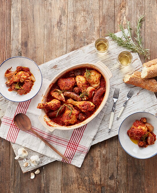 Winter is a great time to make cacciatore, the Italian chicken hunter's stew. This any-day-of-the-week recipe from our meat team will fill your home with inviting aromas instantly: Season a pack of skin-on chicken thighs or a drumstick and thigh combo. Cut 1 large onion and 2 ribs celery into large pieces. Drizzle 4 tbsp olive oil into a Dutch oven over medium heat. Brown chicken all over (we like to add Italian sausage here too). Remove chicken and sausage, then toss in onion and celery and lightly brown. Return chicken and sausage to pan and splash with some white wine if you can, scraping up any brown bits. Add a sprig of rosemary and/or thyme and a 14 to 16 oz can of whole tomatoes. Taste and add salt and pepper as needed. Bring to a simmer, place a lid on top, and let simmer until chicken is cooked and starting to fall off the bone, 15-20 minutes. Serve with some pasta or polenta and roasted broccoli.