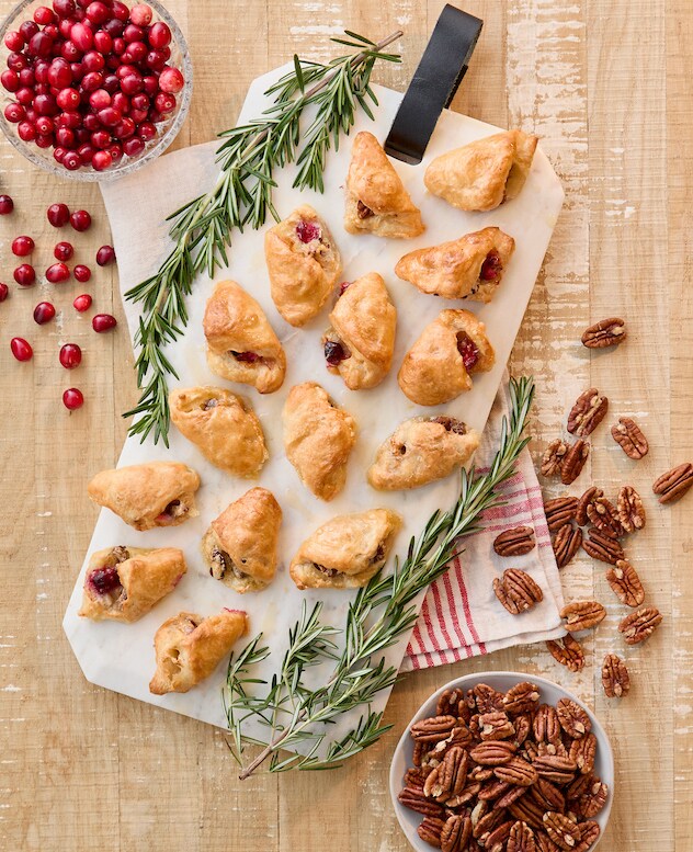 In this festive finger food, tart cranberries are used to cut through the gooey richness of Brie cheese: If frozen, thaw 1 package puff pastry and 1 c cranberries. Preheat oven to 400 F. Roll out puff pastry and cut into roughly 3-inch squares. Tuck each square in the compartment of a muffin tin before filling - this will help retain shape and catch and spill-over from the melty cheese. Place a spoonful of fresh or defrosted cranberries in the center of each square, then top each with a slice of Brie (you'll need about 1 small wheel). Finely chop 1/4 c of pecans and sprinkle on top of Brie slices. Seal the edges together by folding to the center, giving a pinch to ensure they are closed. Bake in the oven until golden, 15-20 minutes. After taking the tray out of the oven, drizzle over 2 tbsp Grand Marnier or orange juice. Serve warm.
