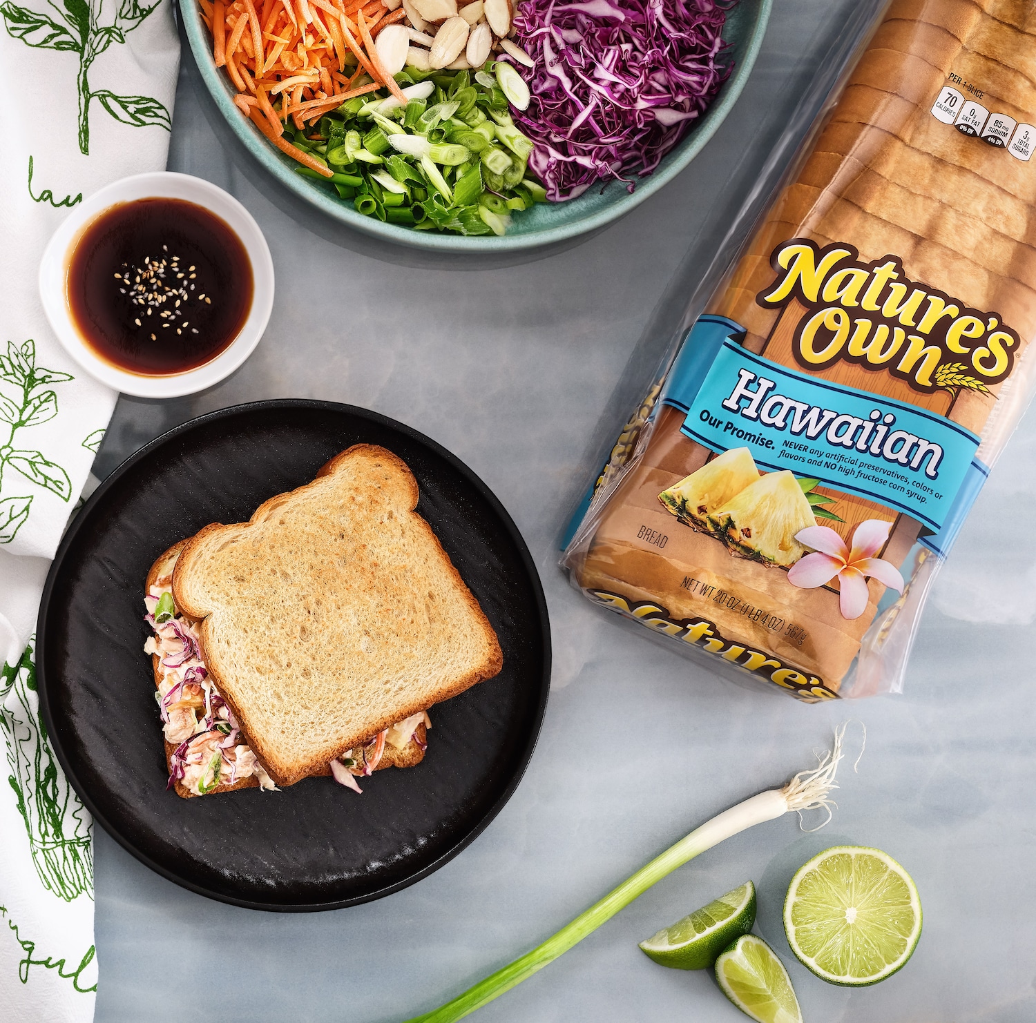 This Hawaiian-inspired salad will bring a tropical twist to your sandwich: Toast 8 slices of Nature's Own Hawaiian Bread. Mix 1 tbsp soy sauce, 1 tbsp rice vinegar, 1/2 tbsp sriracha, 1/2 tbsp honey, 1 tsp minced ginger, and the juice of half a lime in a bowl. Stir in 1/4 cup mayonnaise until combined. Fold in chopped meat from a rotisserie chicken, 1/2 cup shredded red cabbage, 1/2 cup shredded carrots, 1/2 cup pineapple pieces, and 1/3 cup chopped green onion. Scoop the chicken salad onto the toasted bread to make 4 sandwiches and cut each in half.