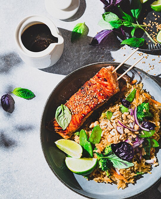 From grill to table in under 10 minutes, this recipe is perfect for summer evenings and simple entertaining. Start by patting 4 salmon filets (about 6oz each) dry and place in a glass baking dish with the skin side up. Create a marinade by thoroughly whisking together 1/4 cup sesame oil, 2 tbsp light brown sugar, 1/4 cup tamari, 3 tbsp rice vinegar, 3 thinly sliced garlic cloves, and white parts of 3 thinly sliced scallions in a medium bowl. Save the green parts of the scallions for later. Reserve 2-3 tbsp of the marinade then pour the rest over the salmon so that each piece is immersed. Marinate for at least 30 minutes. Transfer salmon skin-side down to hot grill and cook for approx. 8 minutes, until lightly charred. Pro tip: oil the salmon before placing on the grill, not the grill itself (use a neutral oil). Once plated, top the salmon with reserved marinade, thinly sliced scallions, and sesame seeds before serving. *Serve only with the marinade that had been reserved before adding to salmon. Never consume a marinade that has already been used on uncooked meat, poultry, or fish.